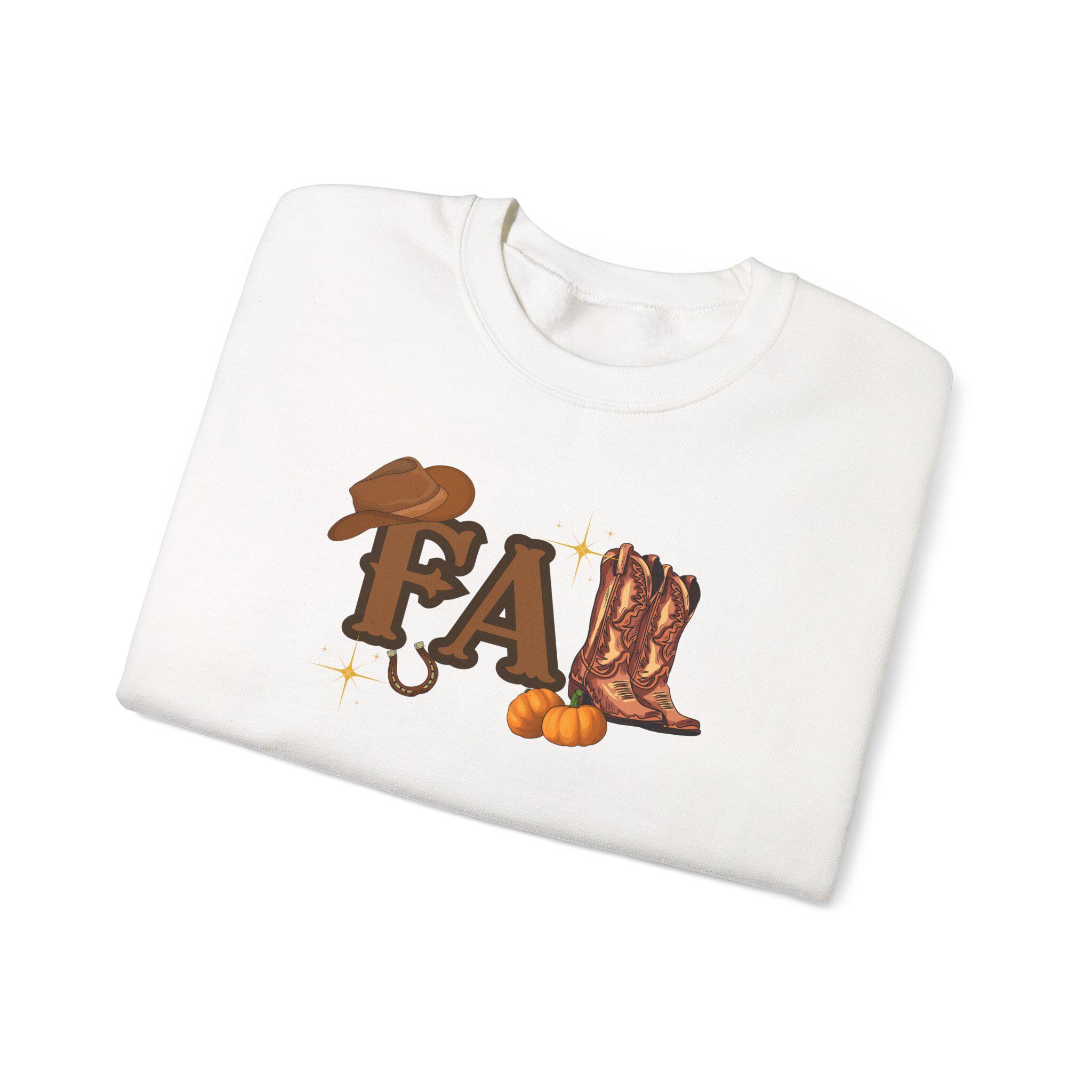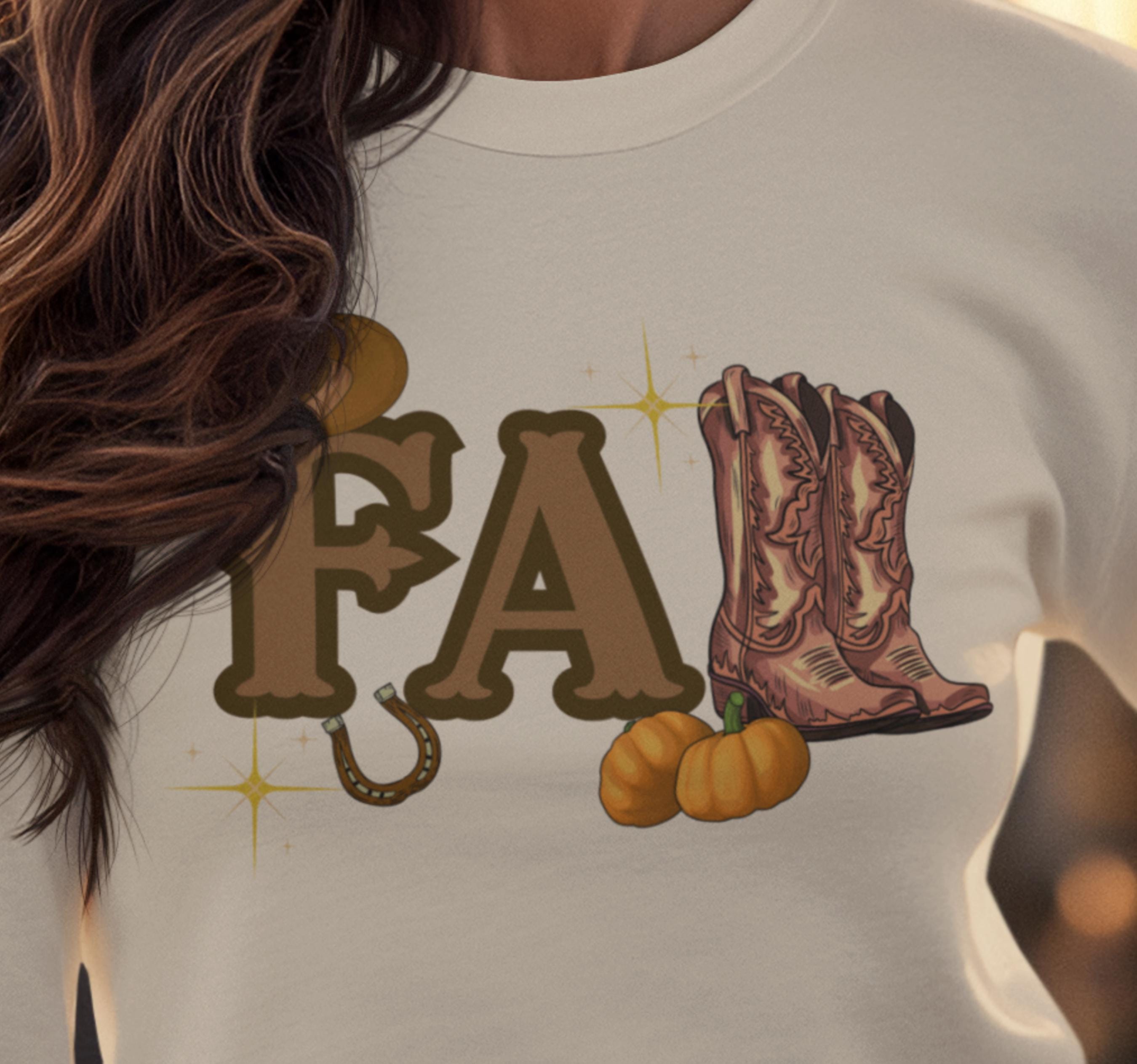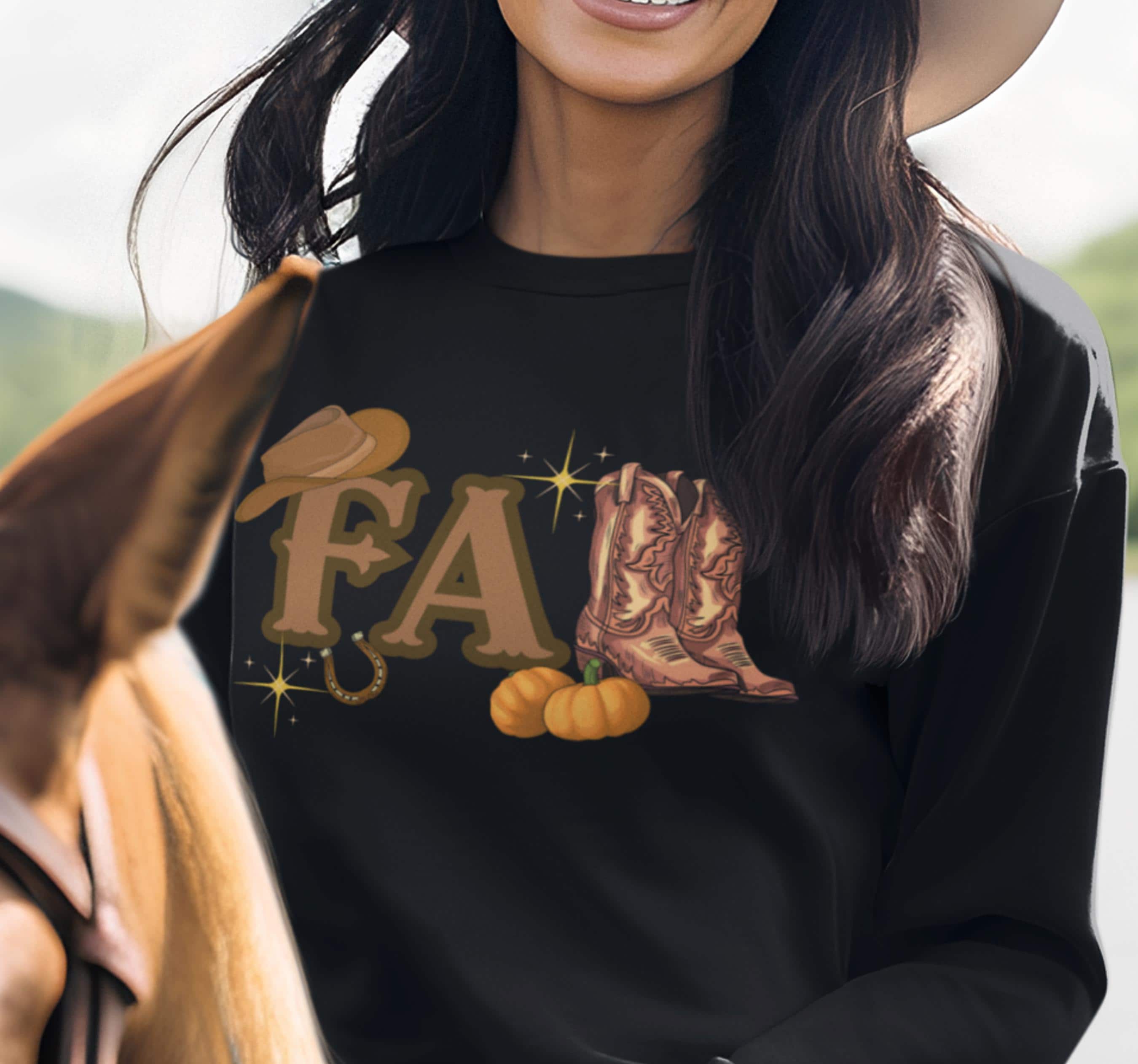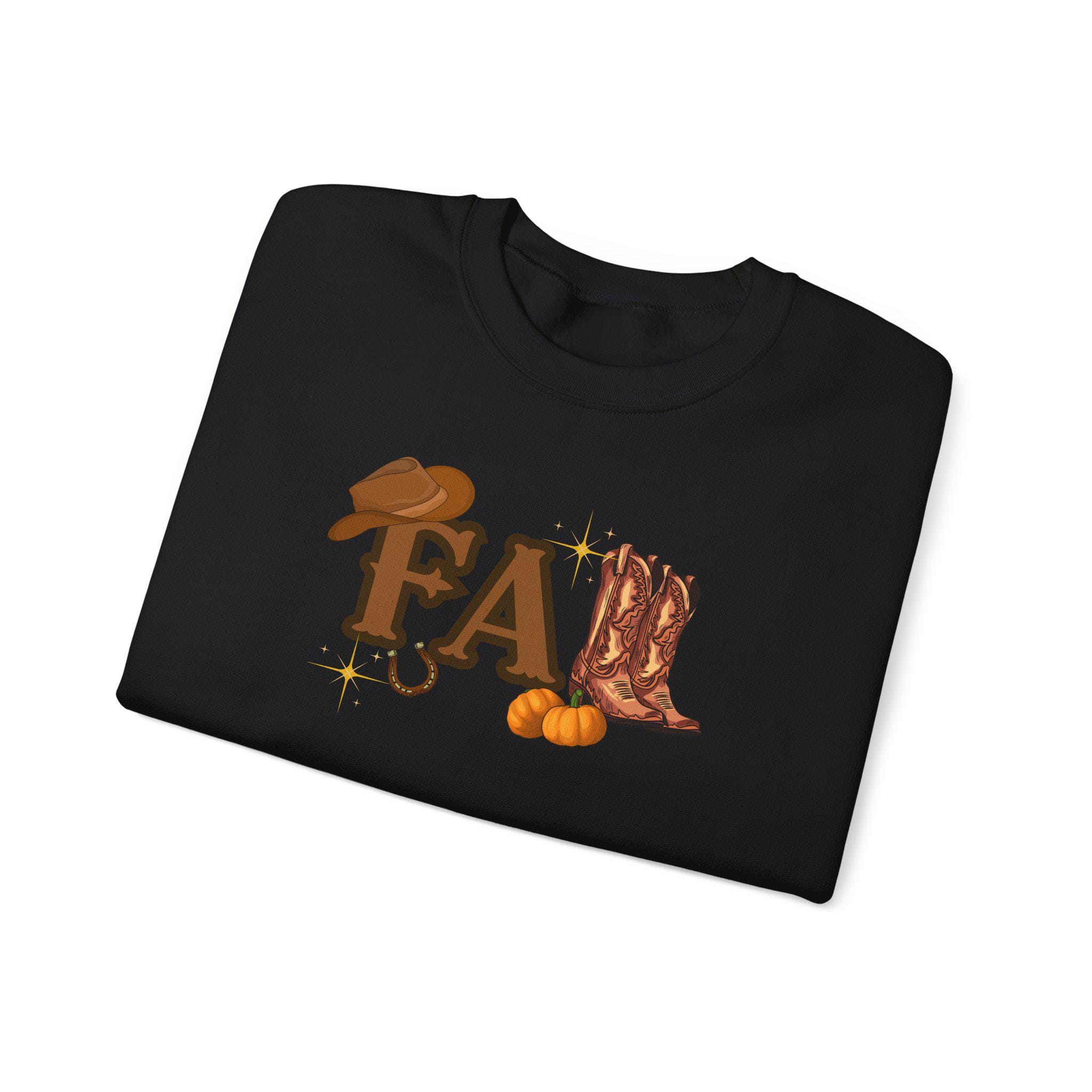 Stay cozy and stylish this fall with a FALL themed sweatshirt featuring cowgirl boots and a hat. Perfect for adults looking for a comfortable yet festive piece to wear during the autumn season. Ideal for fall celebrations and festive occasions.
