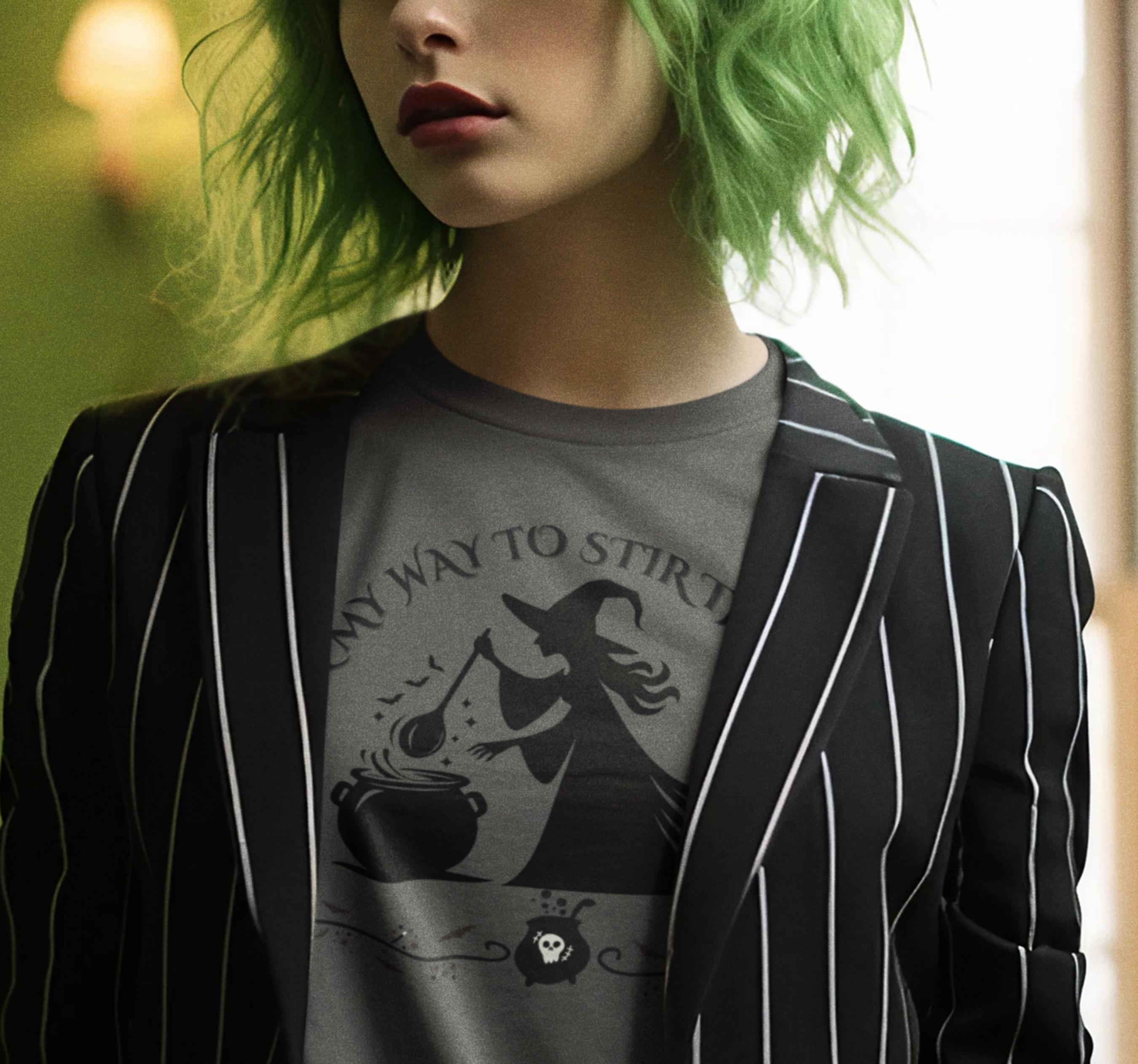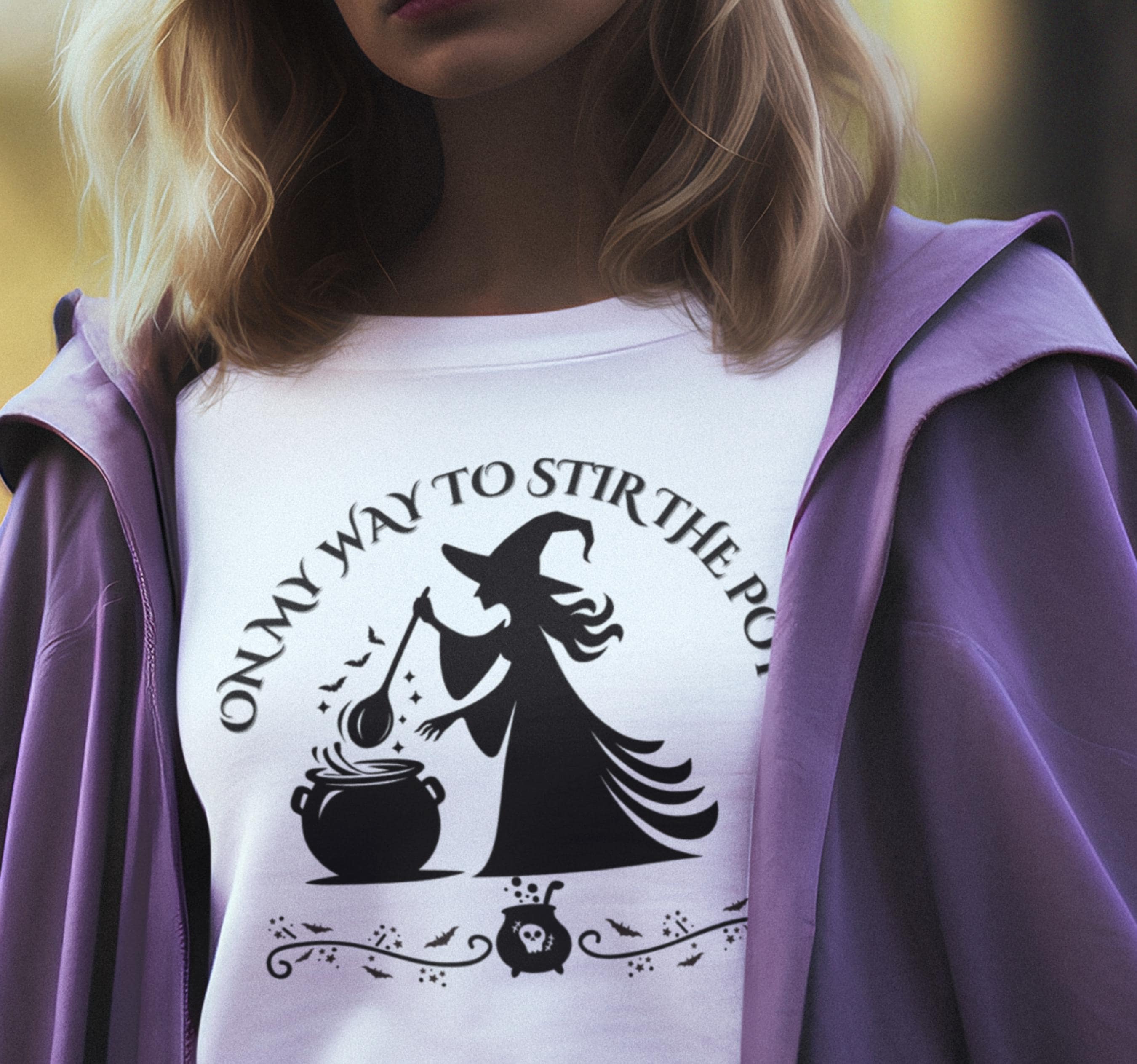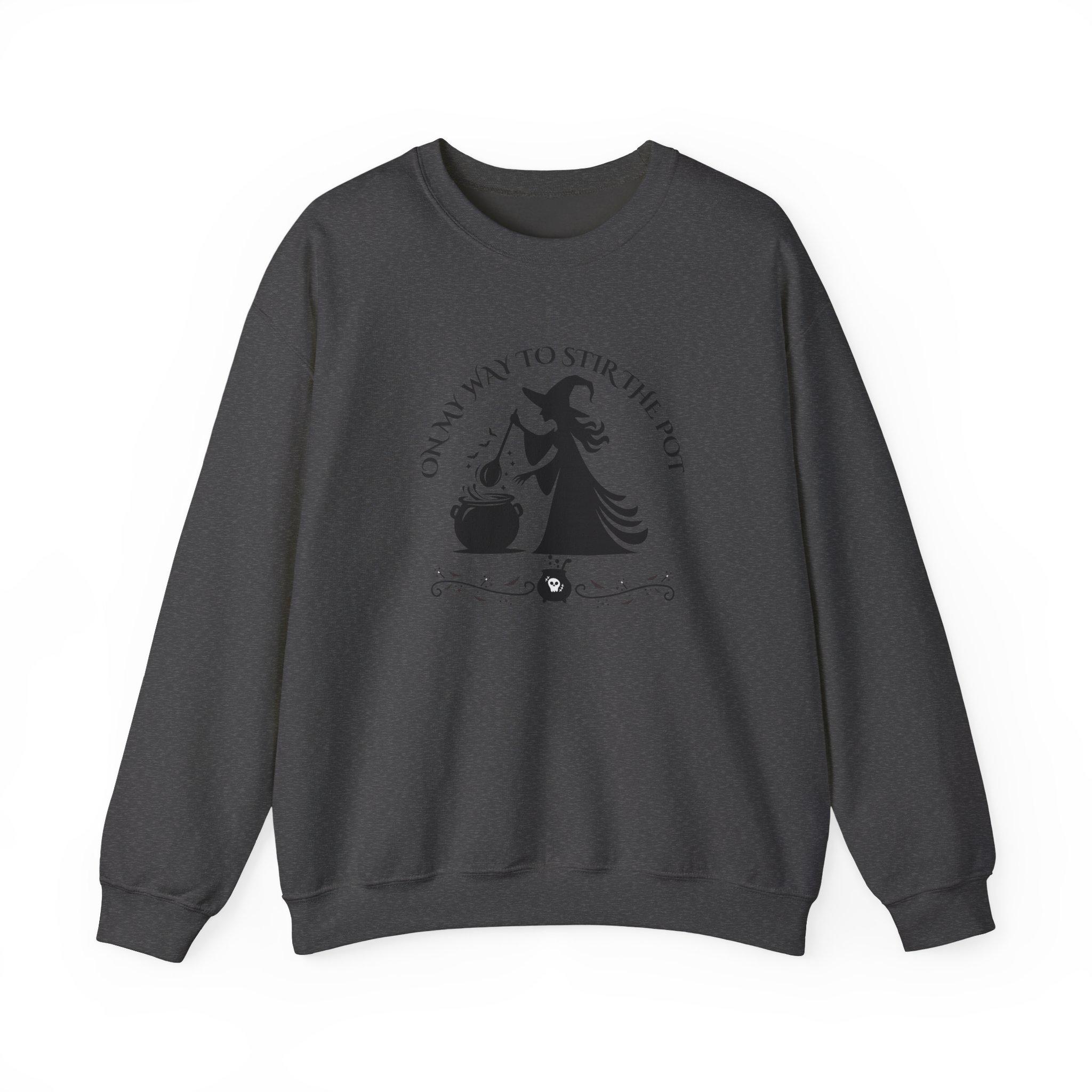 A cozy Heavy Blend™ Crewneck Sweatshirt featuring a design of a witch stirring a black cauldron with the text 'On my way to stir the pot'. This sweatshirt gives off a spooky and witchy vibe, perfect for Halloween or fans of the occult. Ideal for adults looking for a comfortable and stylish piece for the colder months.