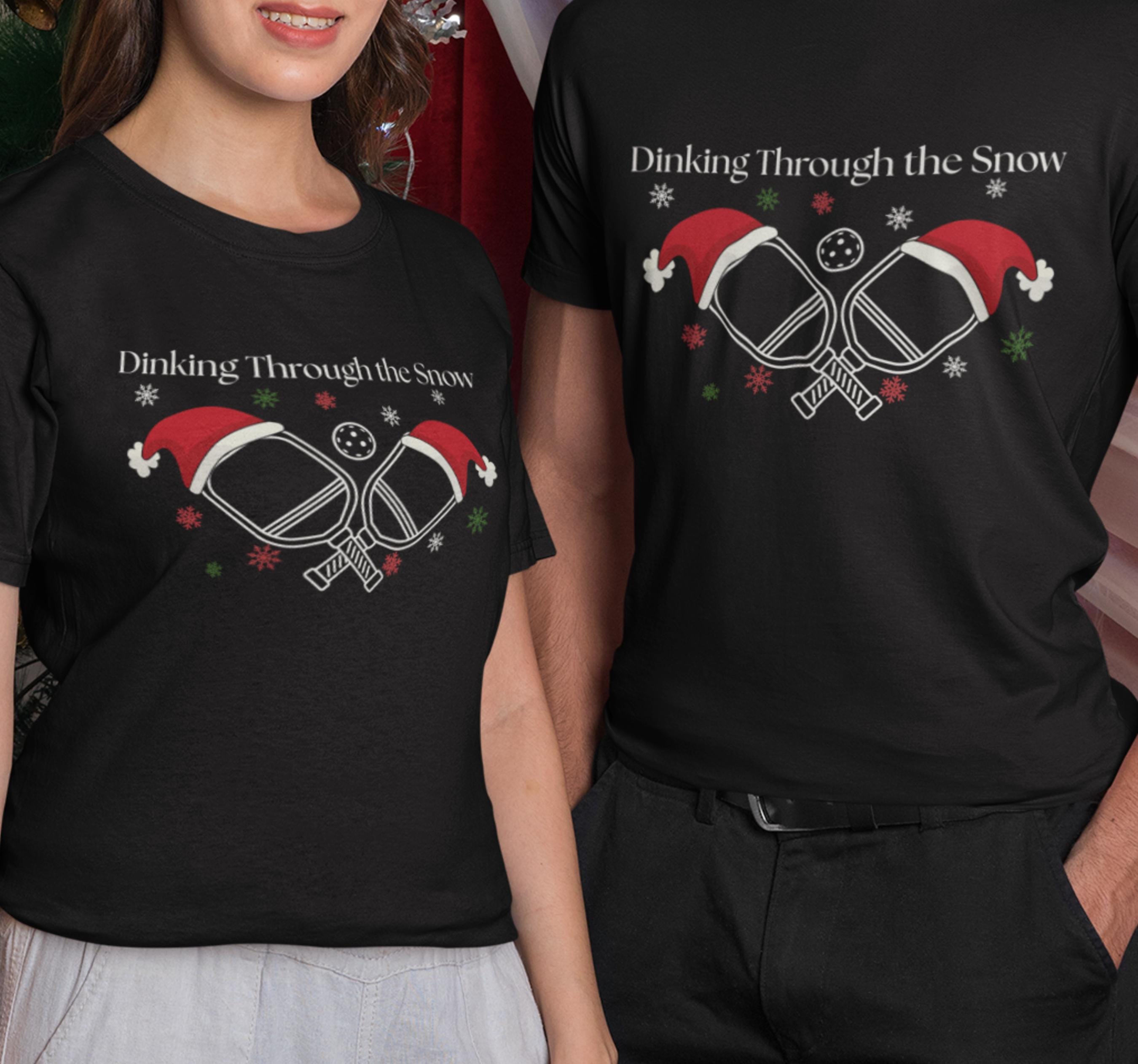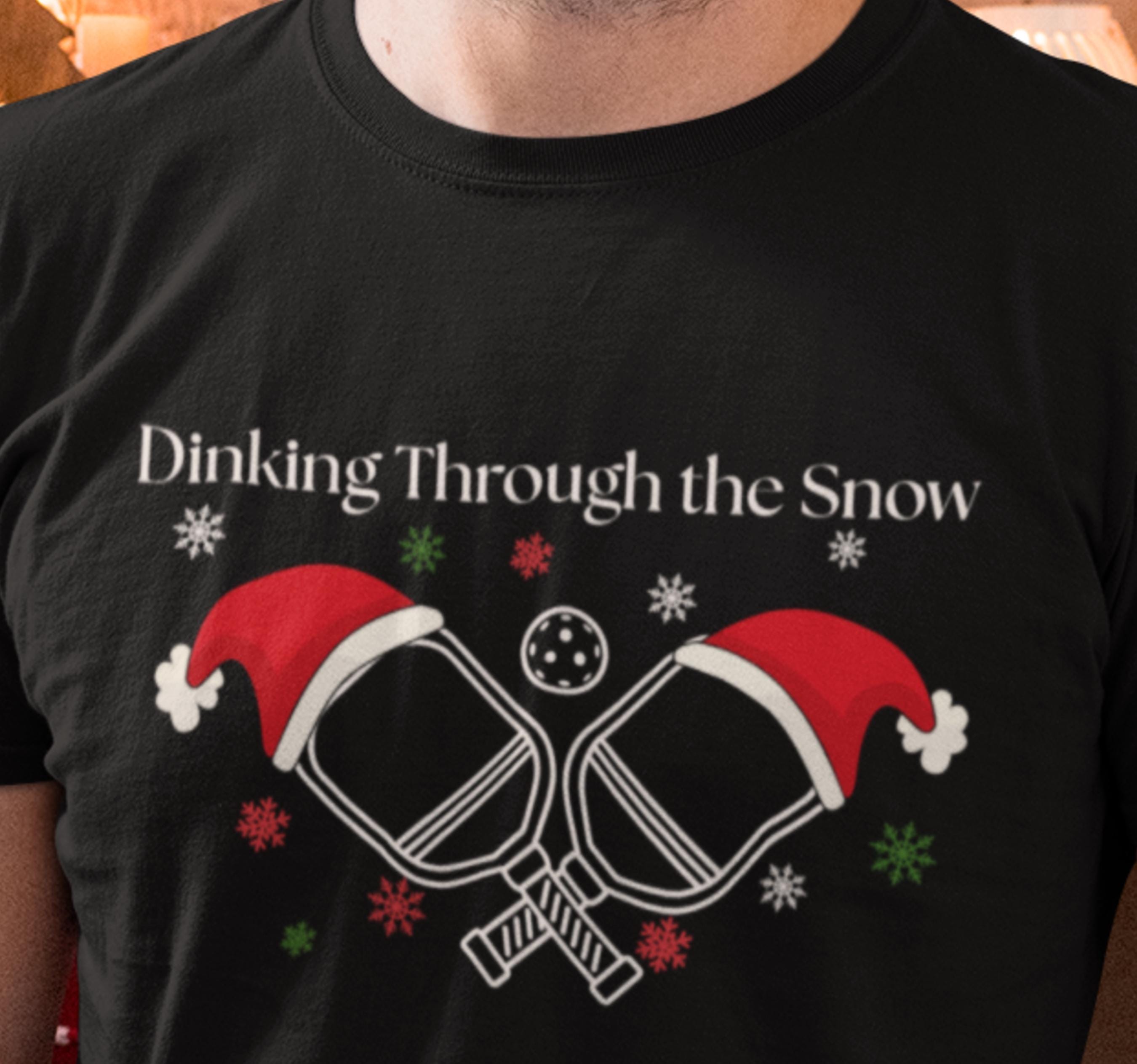 IServe up holiday cheer with this “Dinking Through the Snow” pickleball Christmas shirt! 🎄 Featuring a festive pickleball paddle wearing a Santa hat surrounded by snowflakes, this funny holiday tee is perfect for players who love to dink, smash, and celebrate the season.