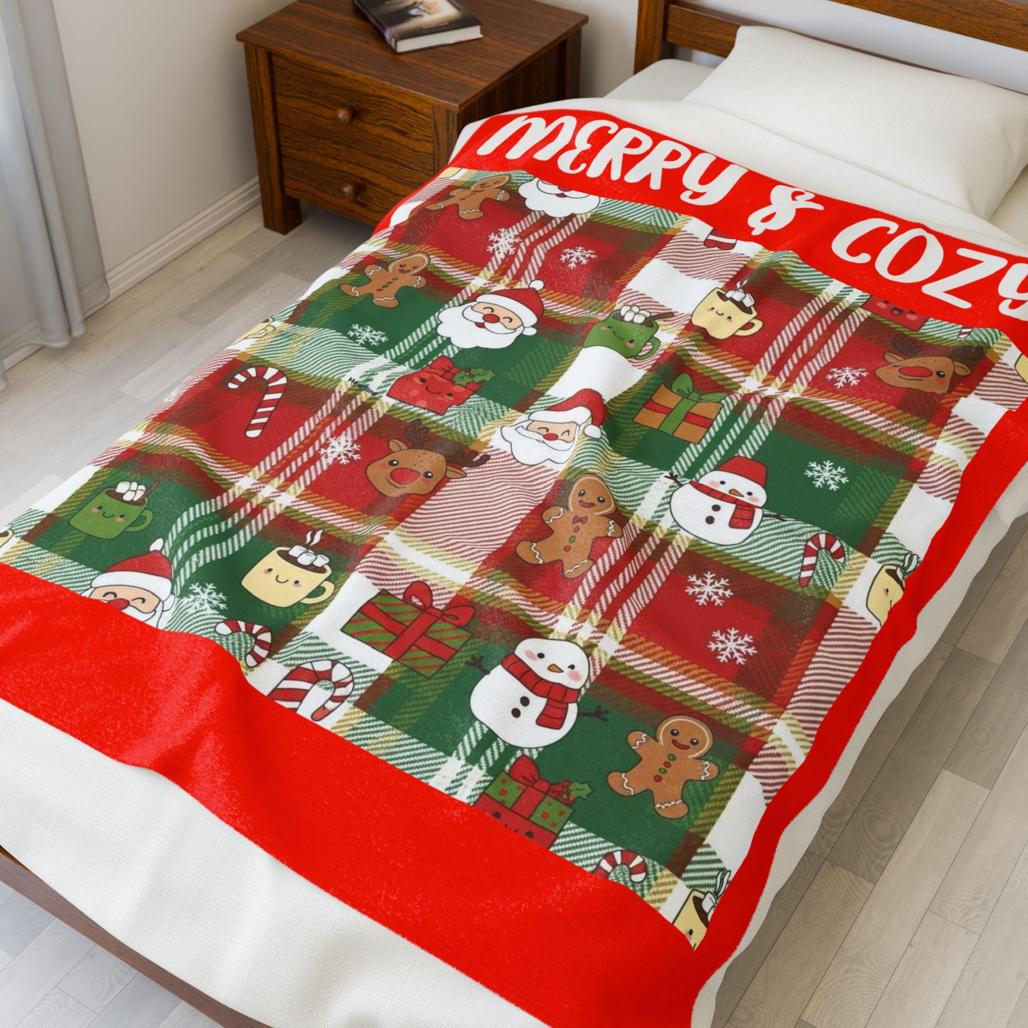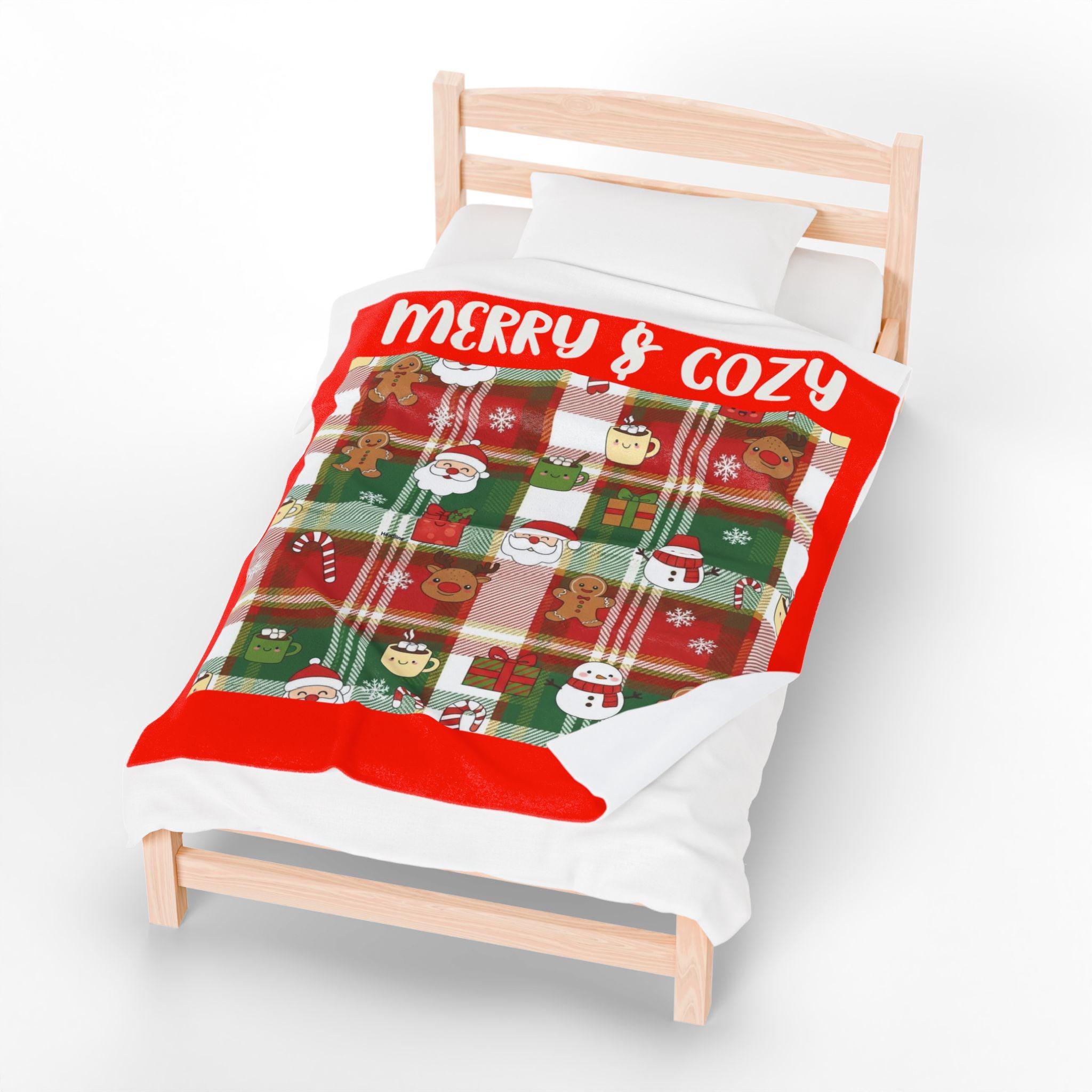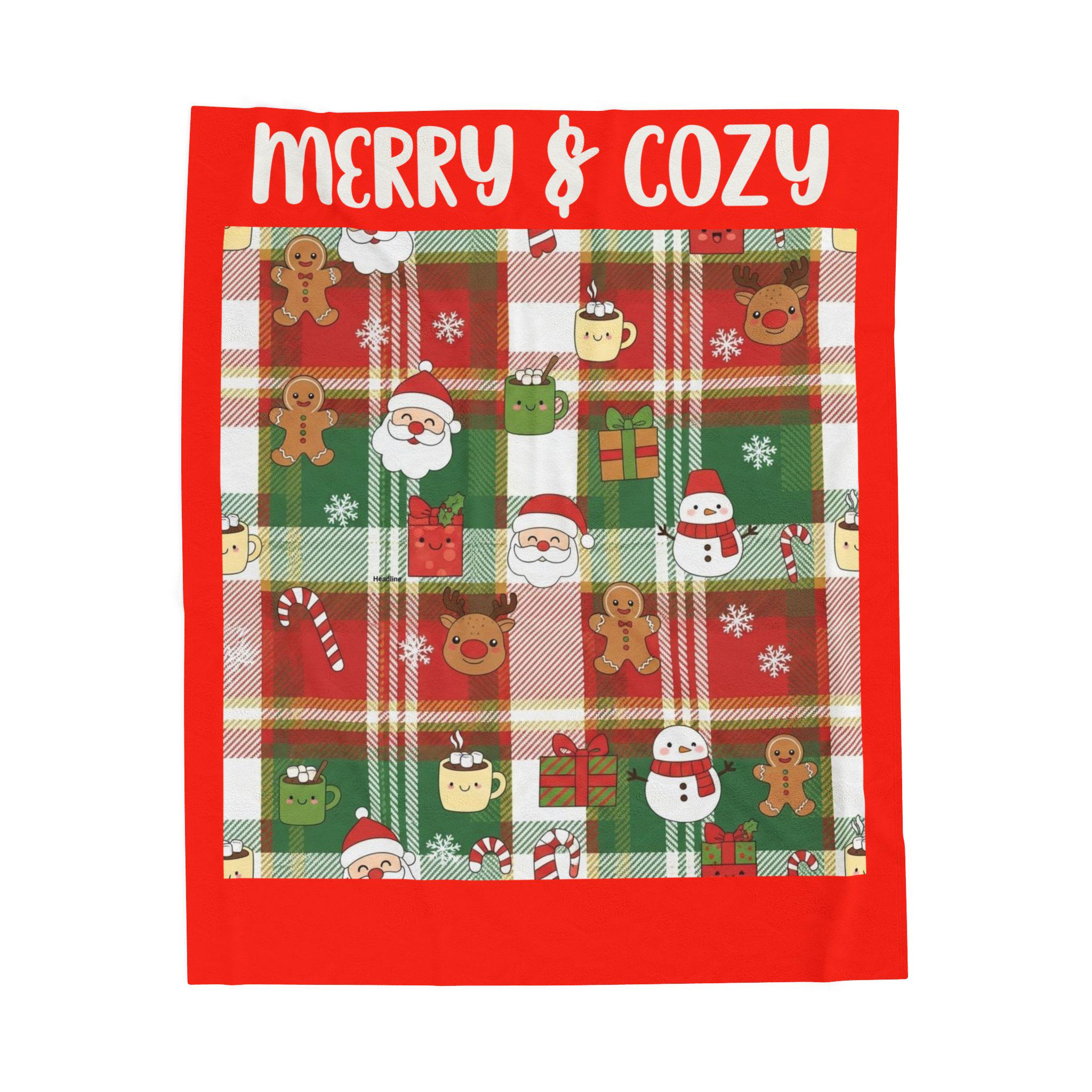 Get into the holiday spirit with this Christmas plaid velveteen plush blanket featuring Santa, hot cocoa, and gingerbread men. The saying 'Merry and Cozy' adds a warm touch, making it perfect for snuggling up by the fire during the festive season. This blanket is ideal for adults who love Christmas and enjoy staying cozy indoors. Perfect for Christmas, winter, and holiday gift-giving.