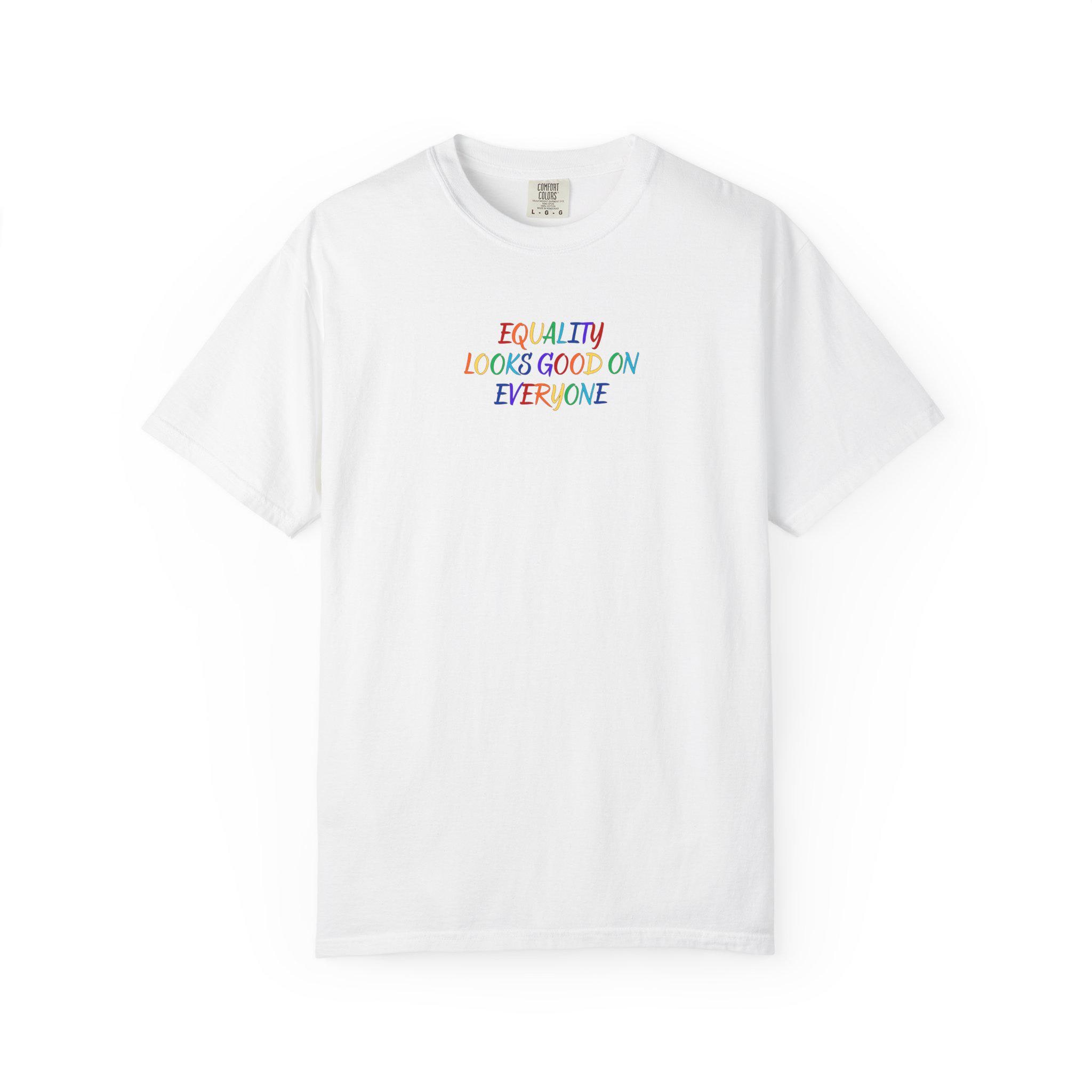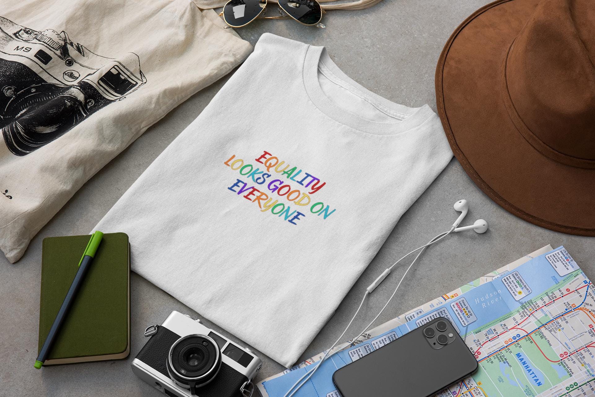 Show your pride and support with this Equality Looks Good on Everyone rainbow shirt. Featuring bold rainbow lettering, it’s the perfect tee for Pride Month, marches, festivals, or everyday wear to spread love and inclusivity. A must-have for allies, activists, and anyone who believes in equality.