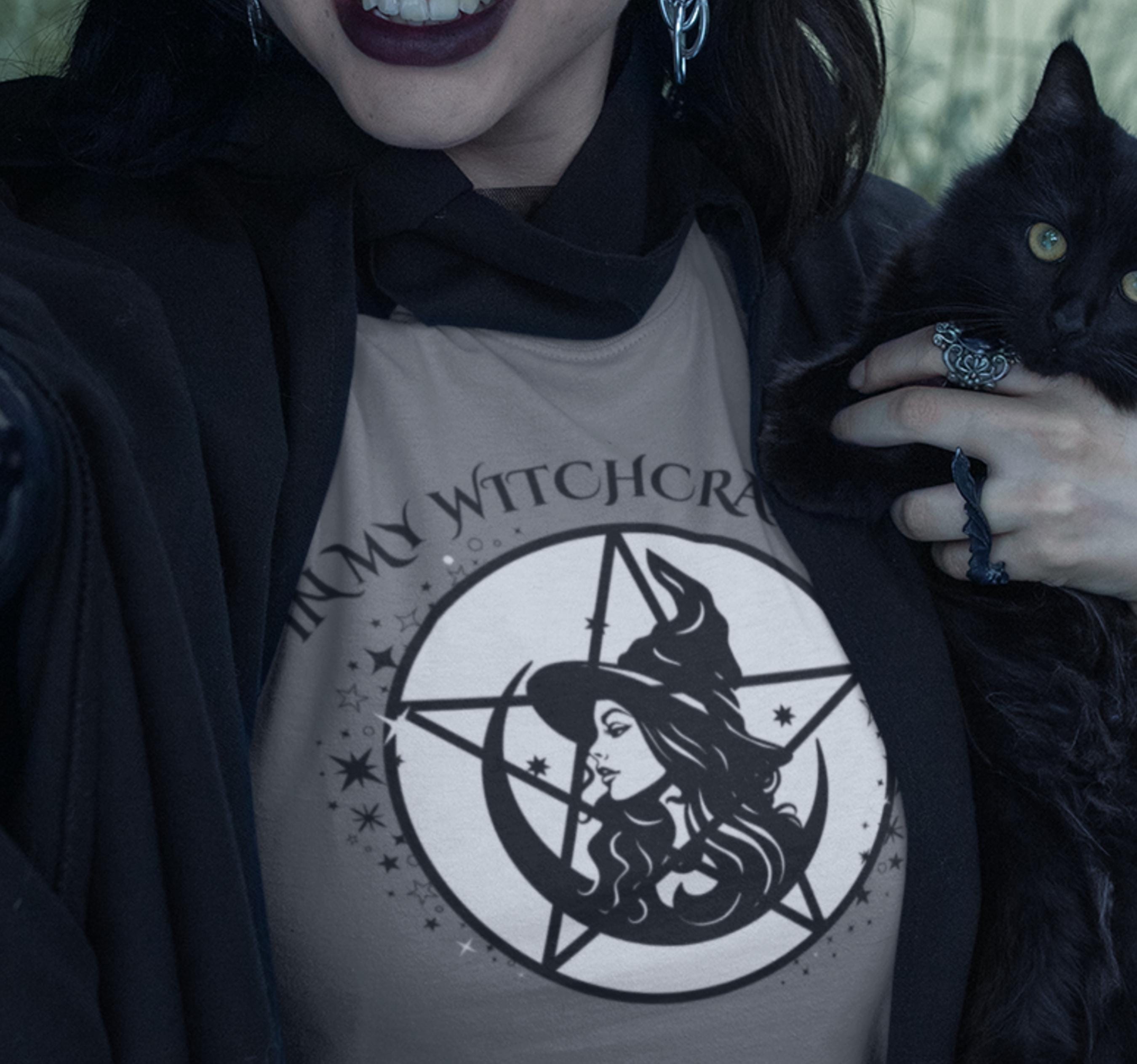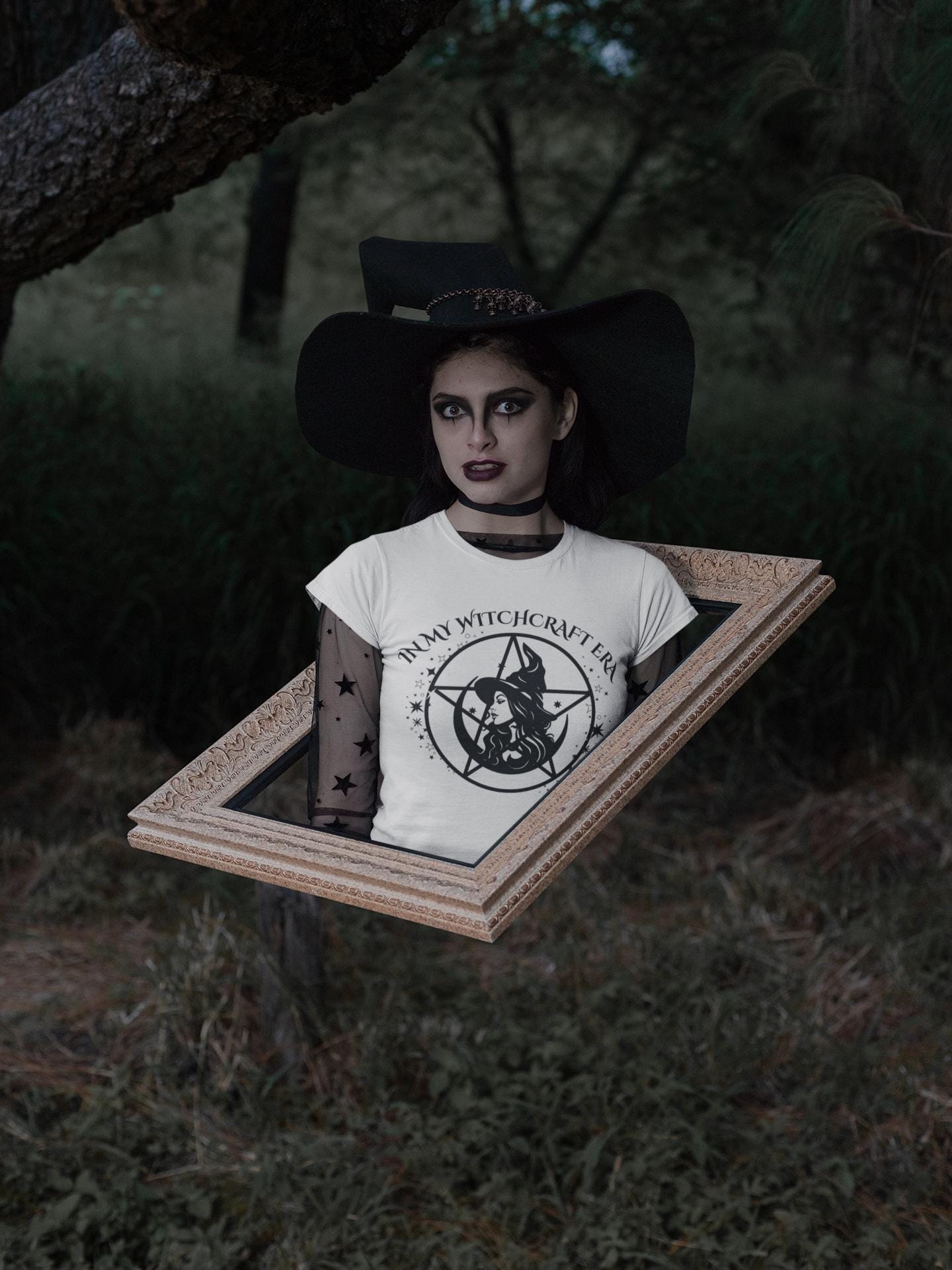 This "IN MY WITCHCRAFT ERA" garment-dyed T-shirt is perfect for those who embrace their witchcraft era. The soft color and texture give off a mystical vibe, making it a great addition to any witchy wardrobe. Ideal for those who love Halloween, occult themes, and embracing their inner witch.