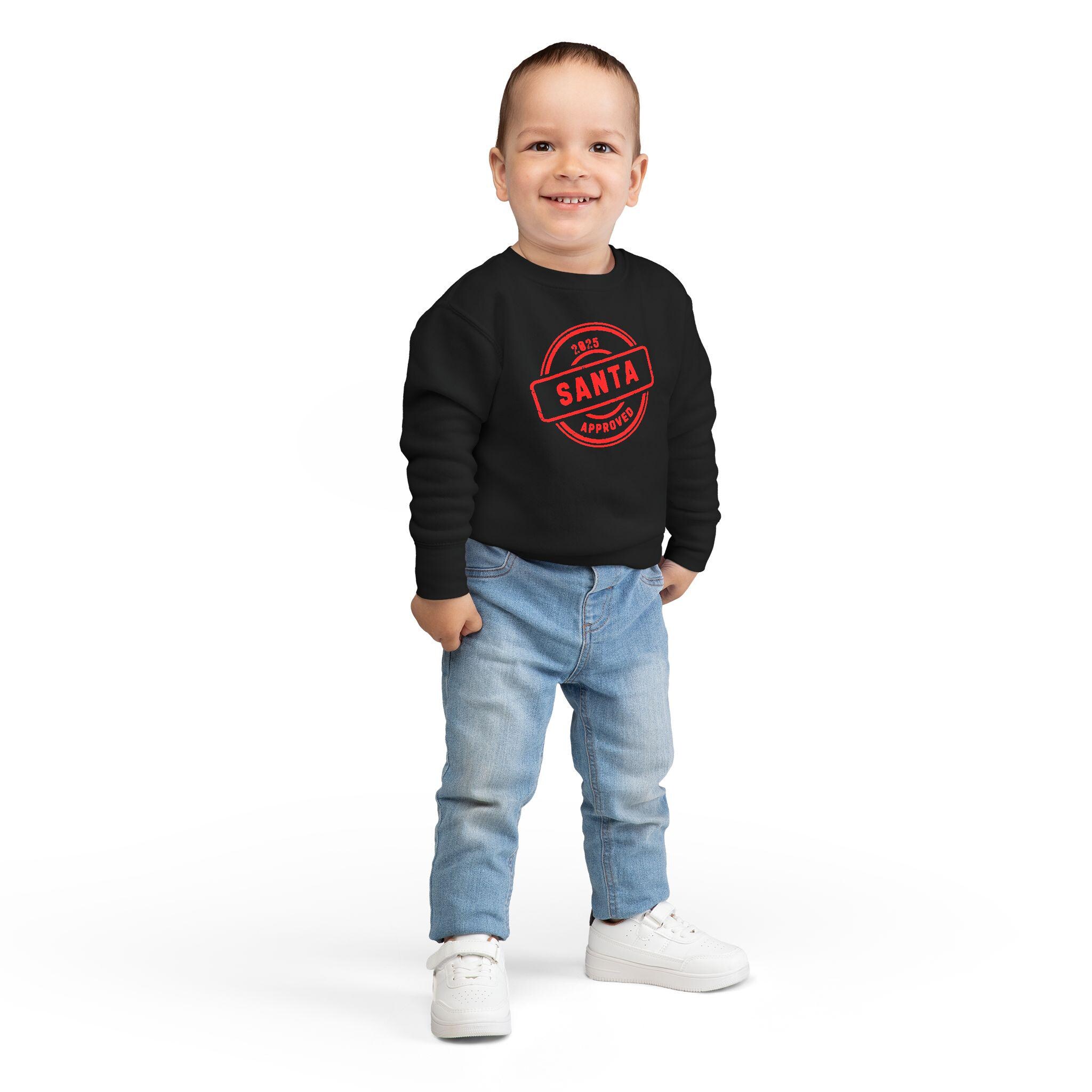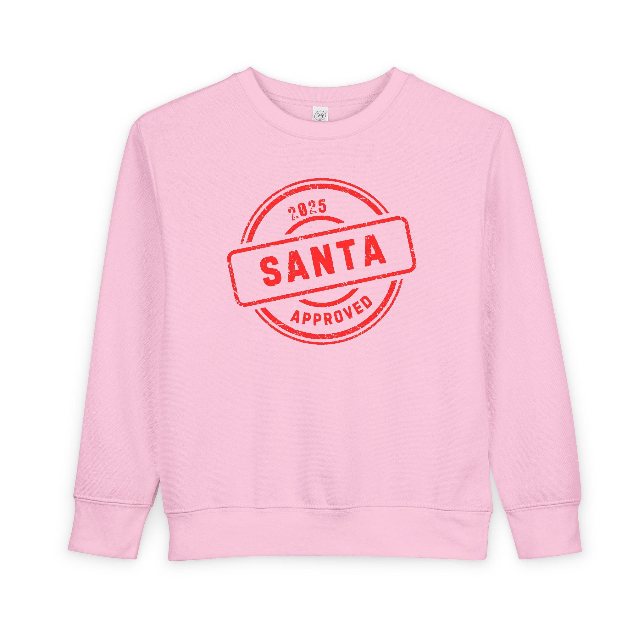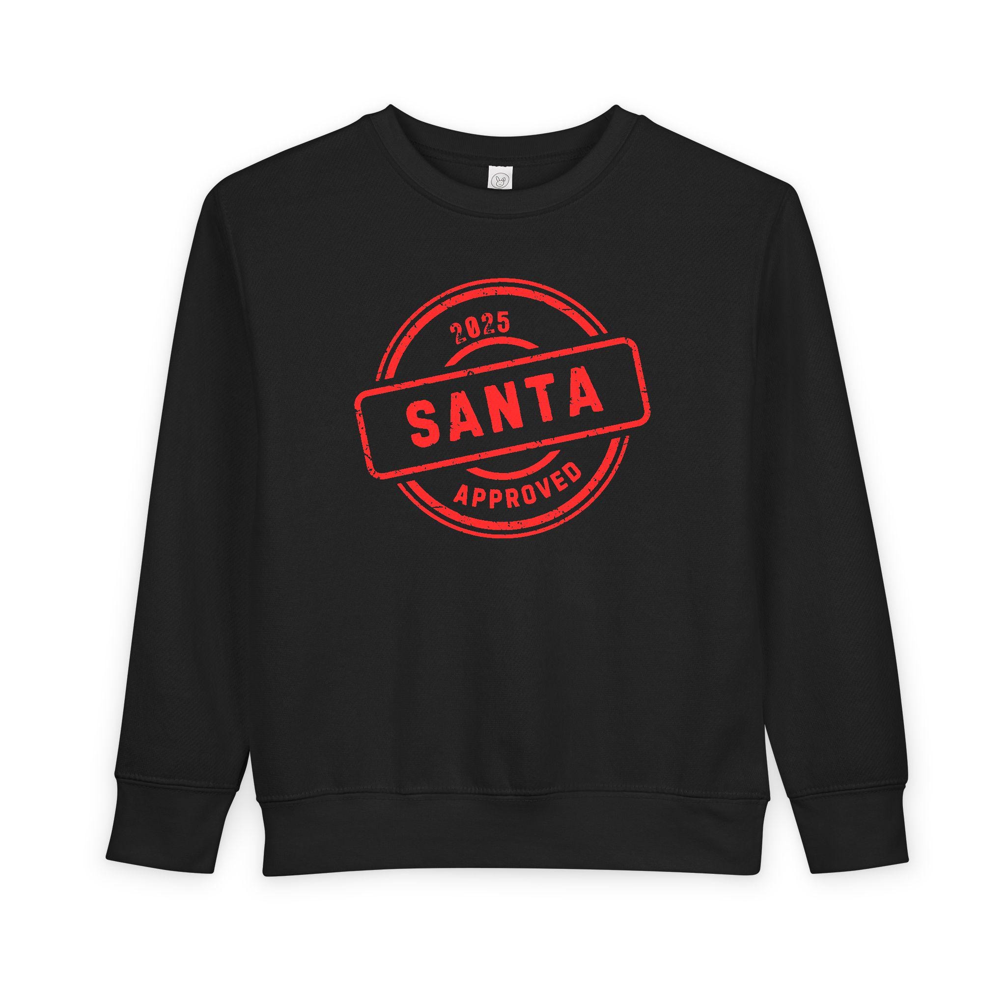 A cute and festive toddler sweatshirt featuring a 'santa 2025 approved' design. Perfect for young children to stay cozy and celebrate the holiday season with style. Ideal for parents looking for a comfortable and playful outfit for their little ones during Christmas time.