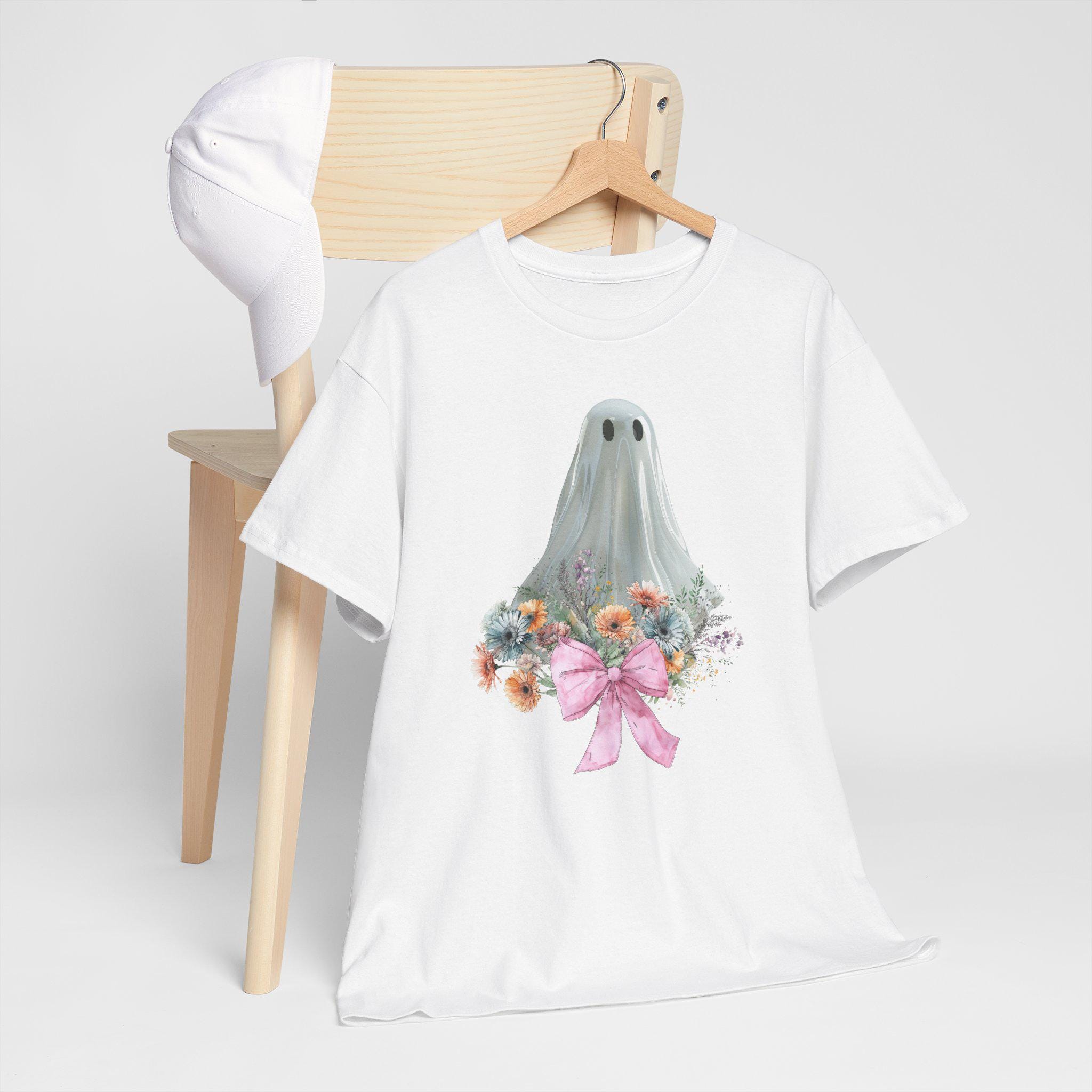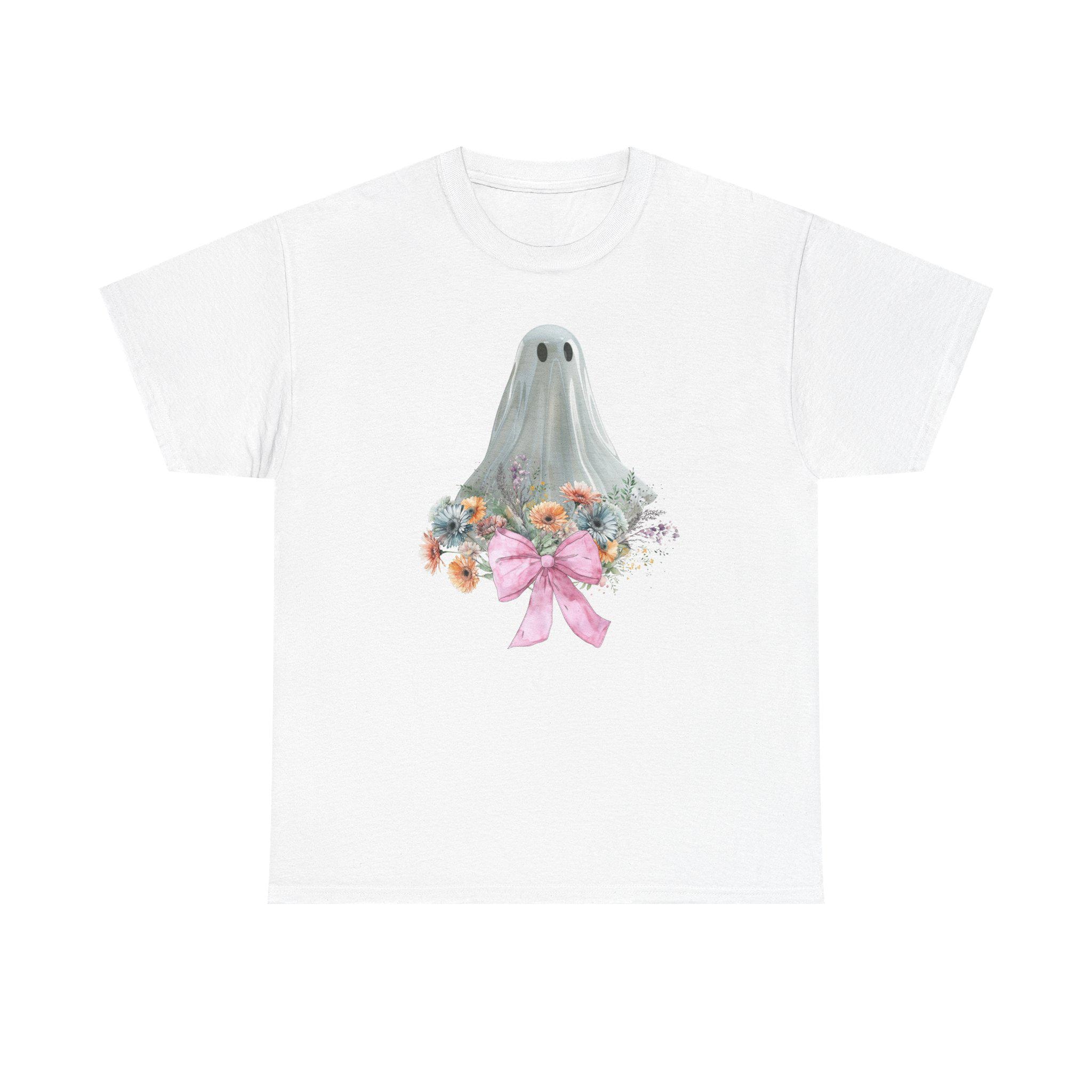Add some sweetness to spooky season with this adorable ghost graphic tee featuring a soft, friendly ghost surrounded by flowers and topped with a pink bow. Perfect for those who love a mix of cute and spooky, this shirt is a fun twist on Halloween style.