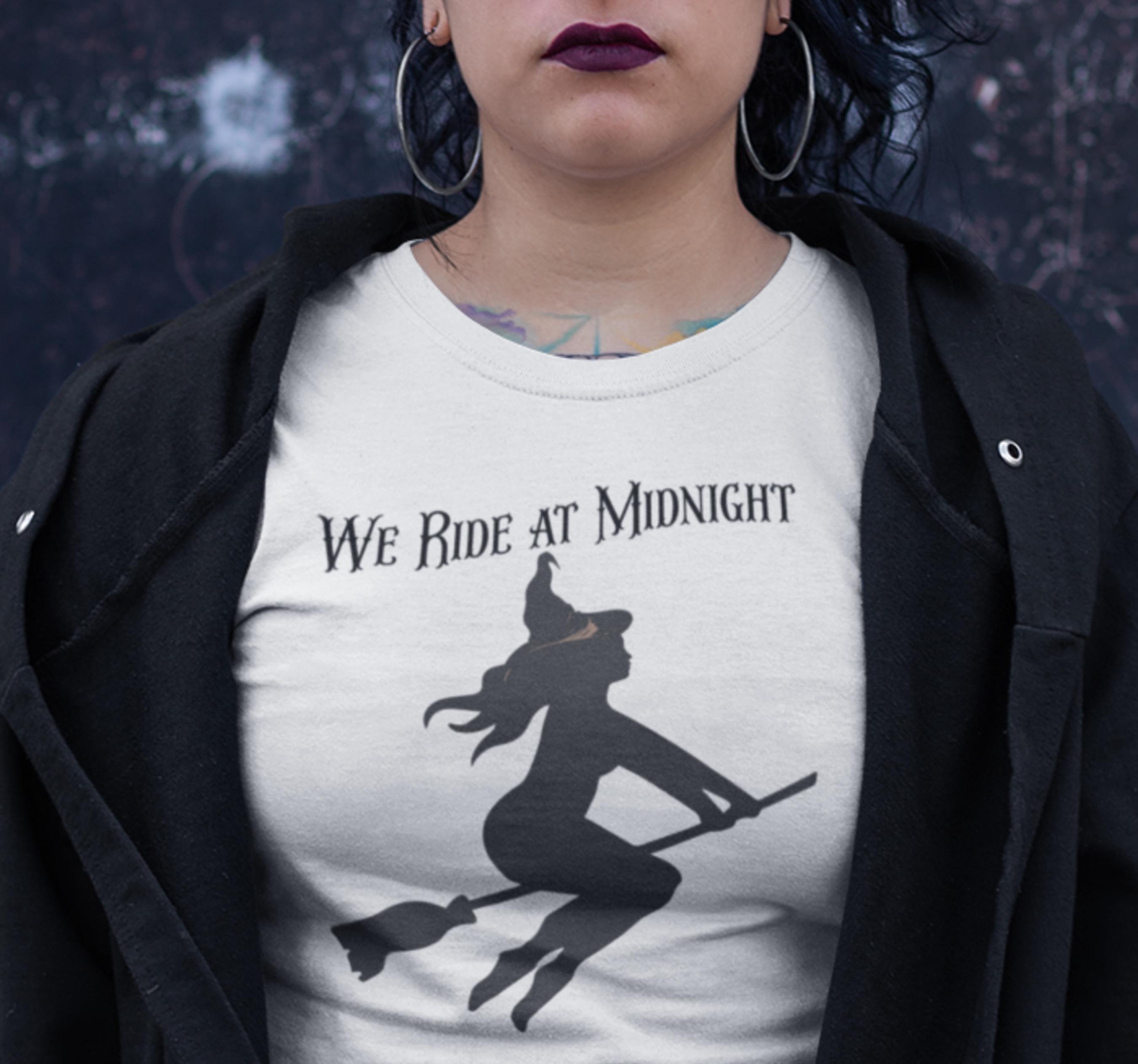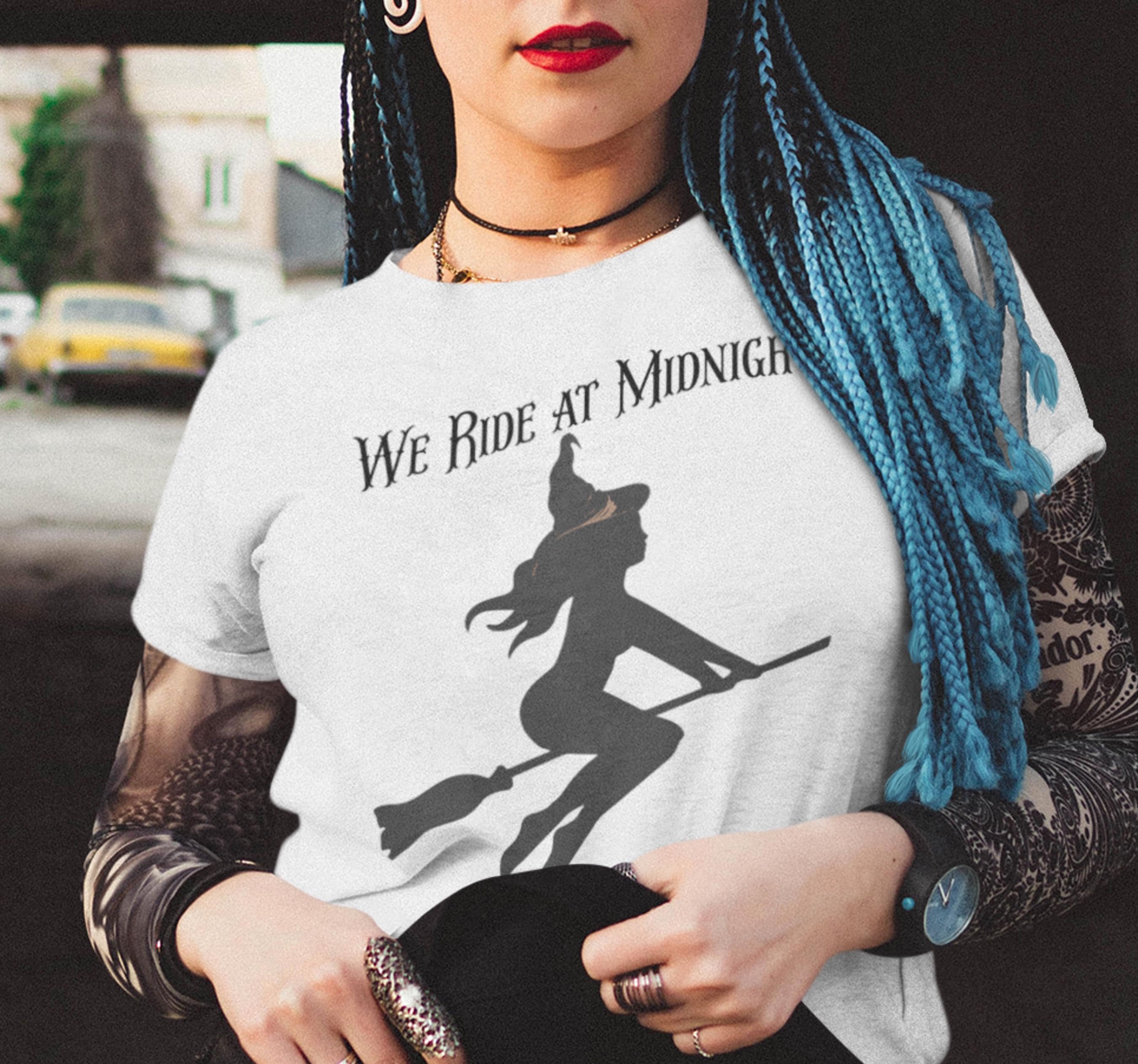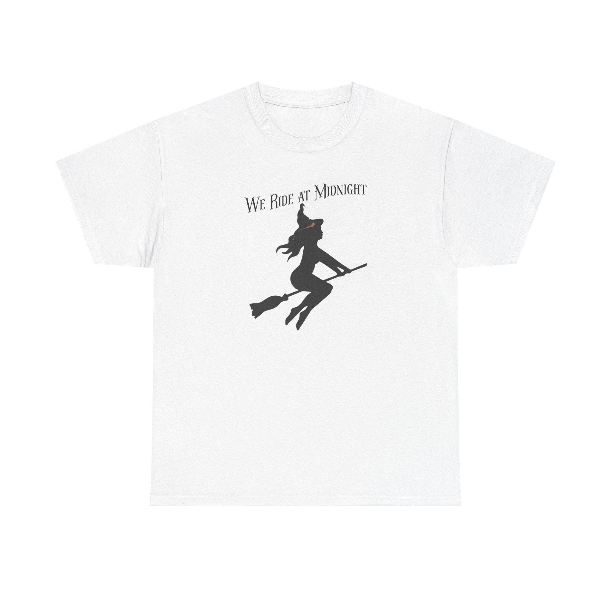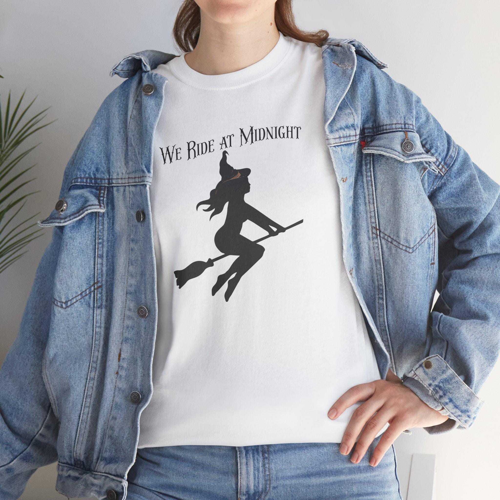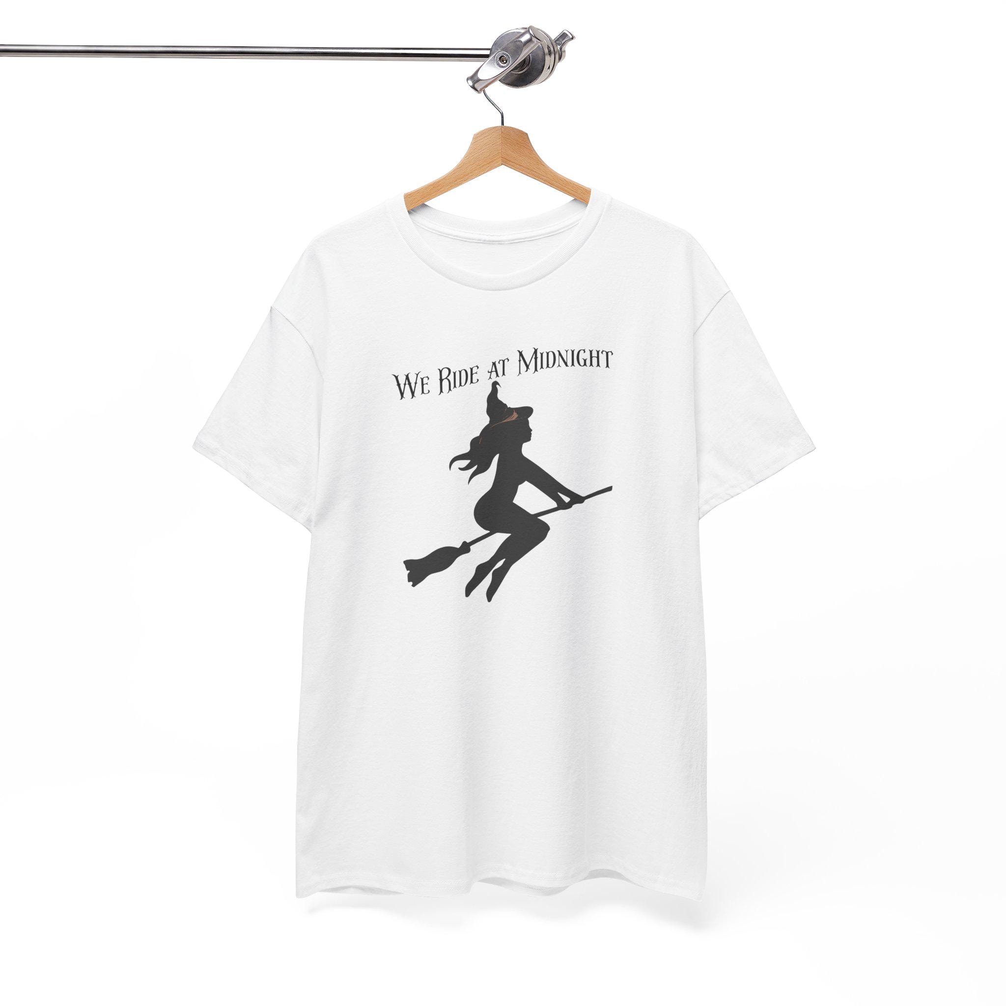 We Ride at Midnight Witch on Broom T Shirt, Unisex Tee, Halloween Shirt, Spooky Graphic Tee, Witchy Apparel